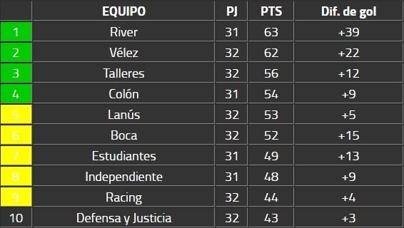 Talleres volvió a la victoria, venció a Huracán en un durísimo partido, y acortó a seis la distancia con River. Además, con los tres puntos, se afirma entre los tres primeros de la tabla anual y, al igual que Boca, podría asegurar su boleto a la Libertadores por la misma vía ya que jugará con Godoy Cruz la otra semi. El Millonario manda en el total y otra victoria lo dejaría casi clasificado.