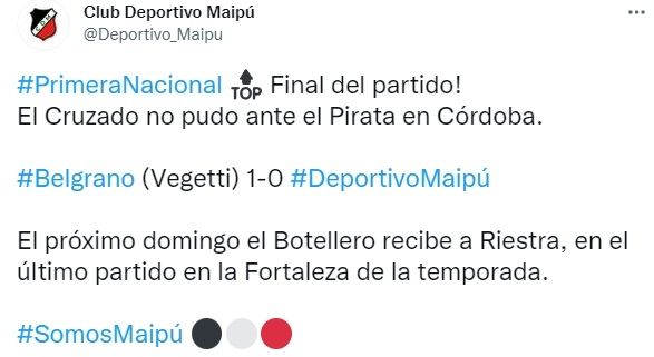 Deportivo Maipú sufrió su carta derrota consecutiva y no logra salir del fondo de las posiciones. El Cruzado visitó a Belgrano, uno de los candidatos a pelear por le ascenso, y cayó por 1 a 0 por un gol de Pablo Vegetti. La victoria le permite al Pirata mantenerse expectante en la lucha por ingresar al Reducido.
