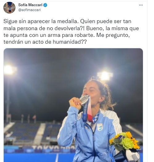Todos los días, desde que ocurrió el hecho, la jugadora postea y pide que se la devuelvan. En una de las últimas, escribió: "Sigue sin aparecer la medalla. Quien puede ser tan mala persona de no devolverla?! Bueno, la misma que te apunta con un arma para robarte. Me pregunto, tendrán un acto de humanidad??".
