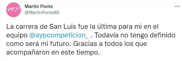 Martín Ponte dijo basta y su futuro en el Turismo Carretera es incierto. En las redes sociales, el piloto de Dodge confirmó su alejamiento del A&P Competición ya que, a su entender, perseguían objetivos diferentes y "no tenía más para hacer". "La carrera de San Luis fue la última para mí en el equipo. Todavía no tengo definido como será mi futuro", escribió.