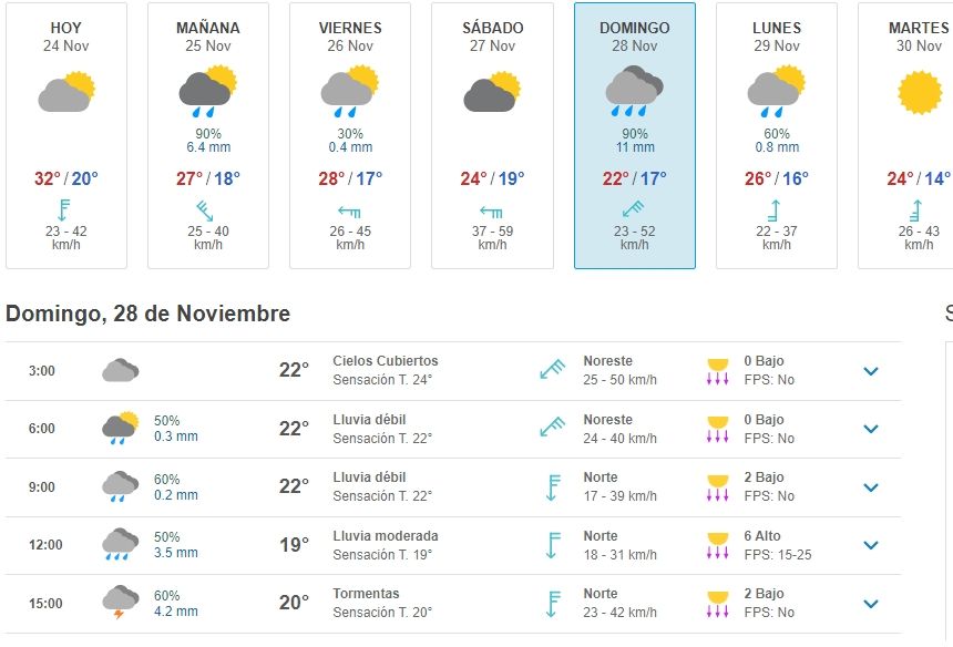 El pronóstico extendido del clima anuncia que para el próximo domingo al rededor de las 9 ya estará lloviendo en la Ciudad de Buenos Aires. De ser correcta la apreciación de los meteorólogos, sería un condimento extra que influirá en la preparación de los distintos equipos de cara última jornada.