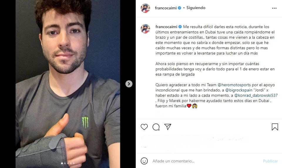 Mediante una publicación en Instagram, el mendocino contó lo ocurrido y dejó en claro que hará lo imposible para poder estar en la rampa de largada del Rally que se realizará en Arabia Saudita: "Me resulta difícil darles esta noticia, durante los últimos entrenamientos en Dubai tuve una caída rompiéndome el brazo y un par de costillas".