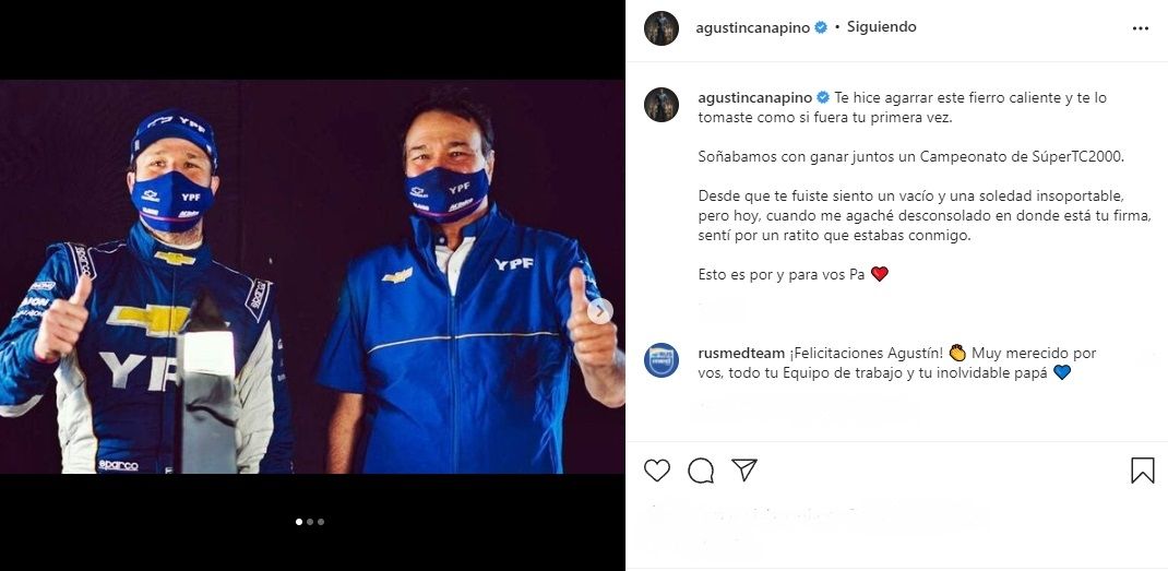 "Te hice agarrar este fierro caliente y te lo tomaste como si fuera tu primera vez. Soñábamos con ganar juntos un Campeonato de SúperTC2000. Desde que te fuiste siento un vacío y una soledad insoportable, pero hoy, cuando me agaché desconsolado en donde está tu firma, sentí por un ratito que estabas conmigo. Esto es por y para vos Pa", escribió el Titán.