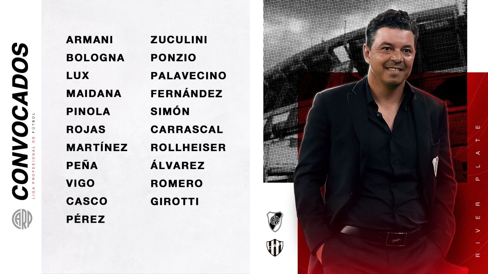 Franco Armani; Rojas, Felipe Peña, Héctor Martínez, Casco; Santiago Simón, Enzo Fernández, Enzo Pérez, Agustín Palavecino; Benjamín Rollheiser y Julián Álvarez, serían los once que el Muñeco pondrá en cancha para buscar una victoria que lo acerque al campeonato.