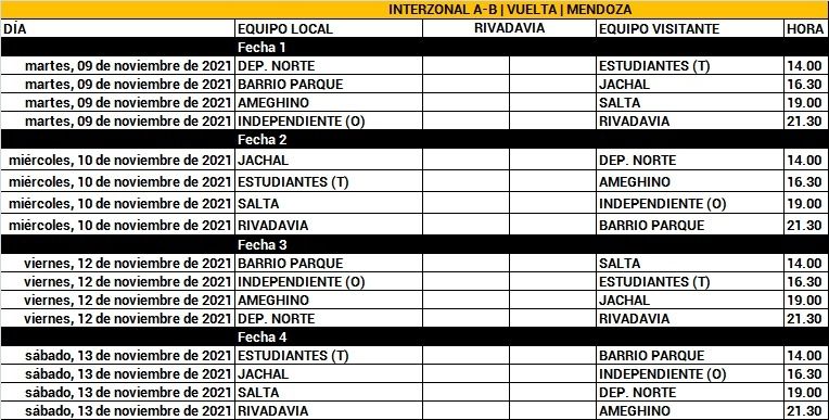 Rivadavia enfrentará el martes 9 a Independiente de Oliva, el miércoles 10 hará lo propio ante Barrio Parque, chocará con Deportivo Norte el viernes 12 y cerrará la sede el sábado 13 ante Ameghino. Cada partido del Naranja será en el último turno, es decir, a las 21:30.