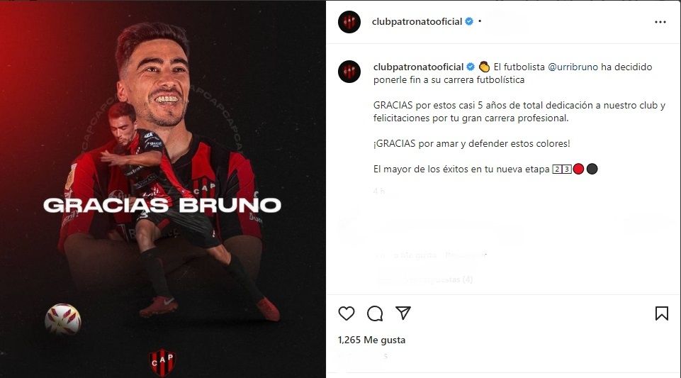 "El futbolista Bruno Urribarri ha decidido ponerle fin a su carrera futbolística. GRACIAS por estos casi 5 años de total dedicación a nuestro club y felicitaciones por tu gran carrera profesional", escribió la institución de Paraná en los diferentes canales de comunicación en las redes sociales.