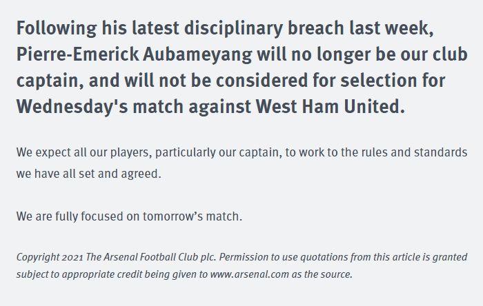"Tras su última infracción disciplinaria la semana pasada, Pierre-Emerick Aubameyang ya no será el capitán de nuestro club y no será considerado para la selección para el partido del miércoles contra el West Ham United", comenzó el comunicado publicado en su página oficial.