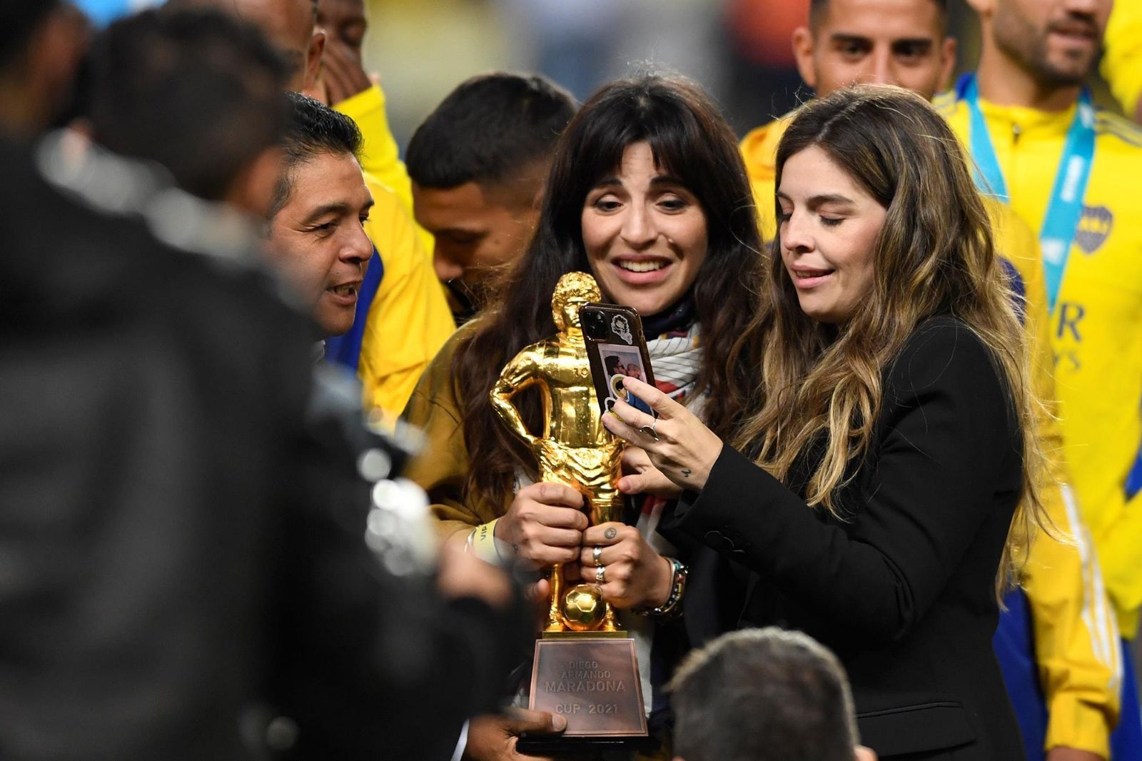 El capitán Carlos Izquierdoz tomó el trofeo e invitó a los Maradona a sumarse a la celebración y posar para la foto. Allí, a las hijas del 10 se las vio muy emocionadas y hasta aprovecharon para besar el trofeo que, a la vez, era la figura de su padre.