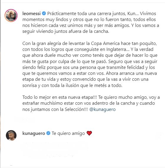"Te quiero mucho amigo, voy a extrañar muchísimo estar con vos adentro de la cancha y cuando nos juntamos con la Selección", fue la frase con la que cerró la publicación y, horas después, el Kun le respondió con una simple frase que estremeció a los seguidores de ambos: "Te quiero amigo".
