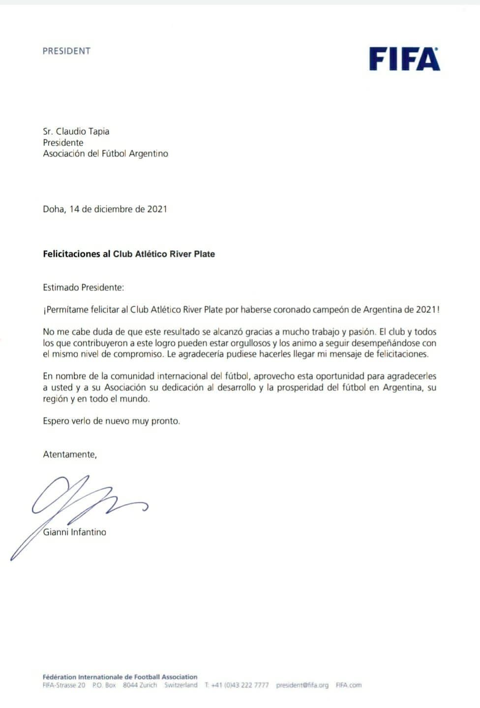 "¡Permítame felicitar a River Plate por haberse coronado campeón de Argentina de 2021!", comienza la carta dirigida a Claudio Tapia y con fecha del 14 de diciembre del 2021.