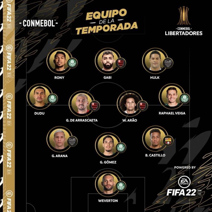 La formación incluye a Weverton (Palmeiras); Byron Castillo (Barcelona de Ecuador), Gustavo Gómez (Palmeiras), Guilherme Arana (Atlético Mineiro); Raphael Veiga (Palmeiras), Willian Arao (Flamengo), Giorgian De Arrascaeta (Flamengo), Dudu (Palmeiras); Hulk (Mineiro), Gabriel Barbosa (Flamengo) y Rony (Palmeiras).