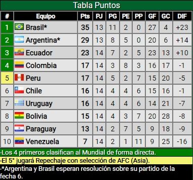Argentina se encuentra en la segunda ubicación de la tabla de posiciones con 29 puntos, producto de ocho triunfos y cinco empates, solamente Brasil se encuentra por encima, con 35 unidades. Ambos seleccionados ya sellaron su clasificación a la próxima cita mundialista que se disputará a partir del mes de noviembre del 2022.