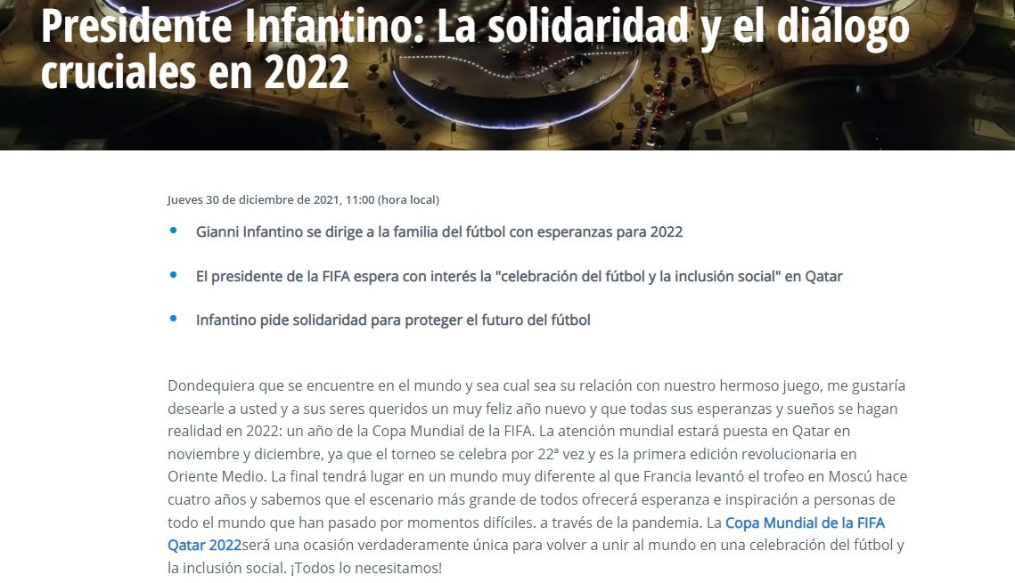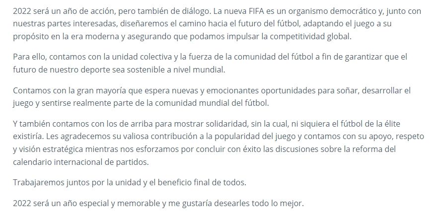 "Me gustaría desearle a usted y a sus seres queridos un muy feliz año nuevo y que todas sus esperanzas y sueños se hagan realidad en 2022: un año de la Copa Mundial de la FIFA. La atención mundial estará puesta en Qatar en noviembre y diciembre, ya que el torneo se celebra por 22ª vez y es la primera edición revolucionaria en Oriente Medio", comenzó el comunicado.