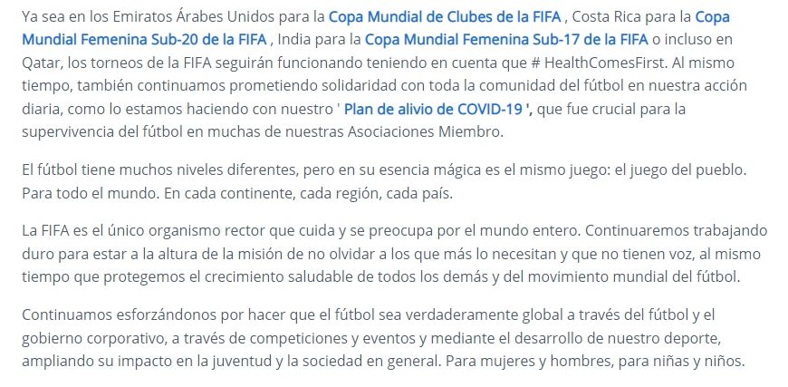 "La FIFA es el único organismo rector que cuida y se preocupa por el mundo entero. Continuaremos trabajando duro para estar a la altura de la misión de no olvidar a los que más lo necesitan y que no tienen voz, al mismo tiempo que protegemos el crecimiento saludable de todos los demás y del movimiento mundial del fútbol", sentenció.
