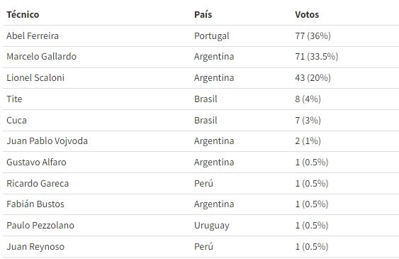 Lionel Scaloni, campeón de la Copa América con Argentina, se ubicó en el tercer lugar con 43 (20%), por delante de los brasileños Tite (8 votos) y Cuca (7).