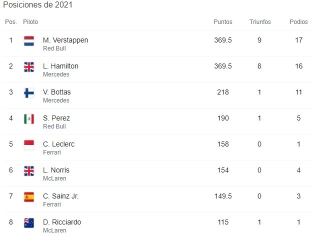 En este sentido, todo se definirá en el circuito de Yas Marina. Los pilotos de Red Bull y Mercedes llegan con los mismos puntos, pero suma, hasta el momento, una victoria más el neerlandés Verstappen (lleva nueve). El único antecedente de una definición de este tipo se dio en 1974 en el GP de Estados Unidos en el circuito de Watkins Glen.