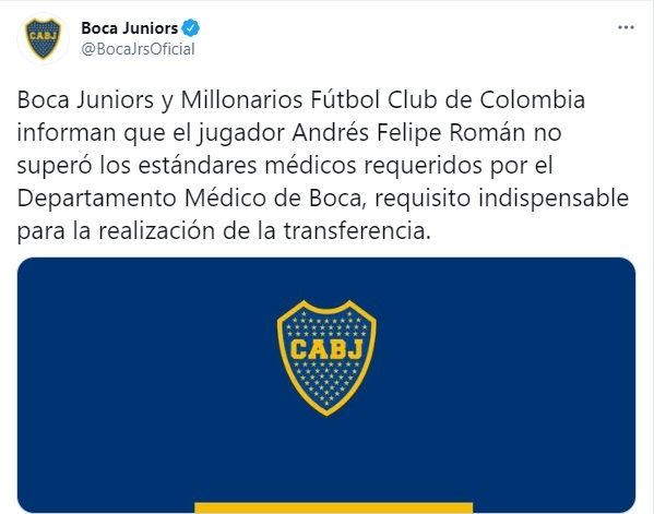 Boca, que buscó un lateral derecho en este mercado, finalmente no pudo incorporar a ninguno: se cayó el pase de Andrés Felipe Román, jugador del Millonarios de Colombia. El Xeneize tenía todo acordado para sumar al futbolista: la idea era comprar el 50 por ciento del pase en dos millones de dólares. Sin embargo, no pasó la revisión médica.