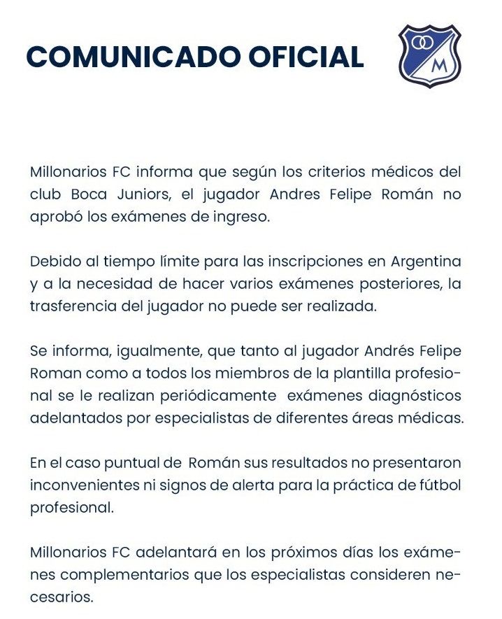 "Se informa, igualmente, que tanto al jugador Andrés Felipe Román como a todos los miembros de la plantilla profesional se les realizan periódicamente exámenes diagnósticos adelantados por especialistas de diferentes áreas médicas… En el caso puntual de Román sus resultados no presentaron inconvenientes ni signos de alerta para la práctica de fútbol profesional", escribieron.