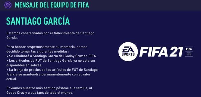 Y continuaron: "Para honrar respetuosamente su memoria, hemos decidido tomar las siguientes medidas: se eliminará a Santiago García del Godoy Cruz en FIFA; los artículos de FUT de Santiago García ya no estarán disponibles en sobres; la franja de precios de los artículos de FUT de Santiago García se mantendrá permanentemente con el valor actual".