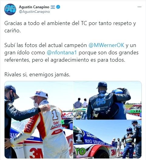 "Gracias a todo el ambiente del TC por tanto respeto y cariño. Subí las fotos del actual campeón @mwernerok y un gran ídolo como @norbertofontana porque son dos grandes referentes, pero el agradecimiento es para todos. Rivales si, enemigos jamás", escribió Agustín quien se adueñó de todos los puntos que hubo en juego y lidera el certamen del TC con 47 unidades.