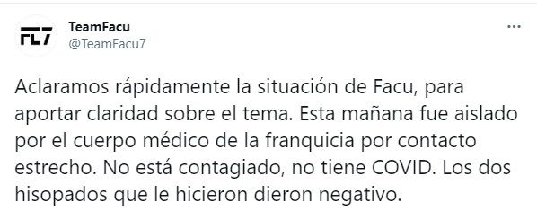 "Aclaramos rápidamente la situación de Facu, para aportar claridad sobre el tema. Esta mañana fue aislado por el cuerpo médico de la franquicia por contacto estrecho. No está contagiado, no tiene COVID. Los dos hisopados que le hicieron dieron negativo", escribió y minutos más tarde confirmó: "Confirmamos que Facu hoy NO juega".