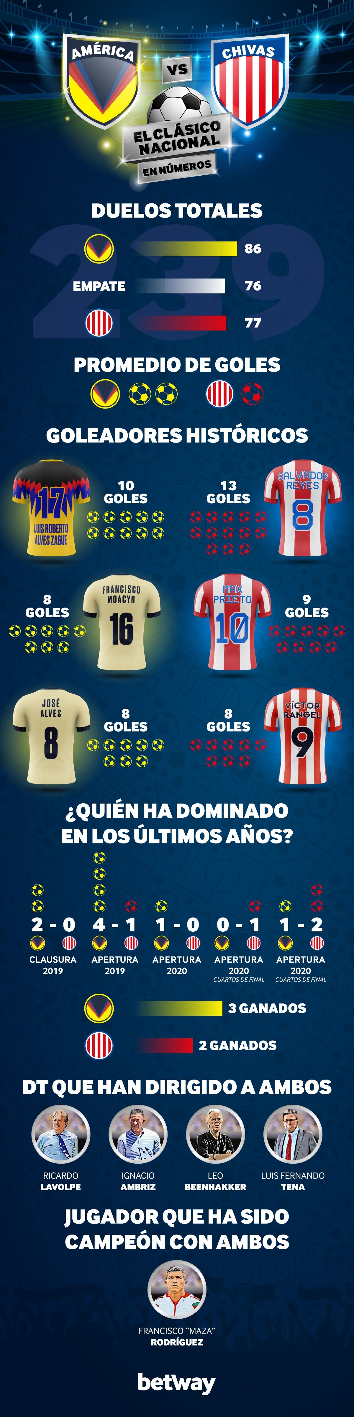 Poniendo la mirada en los precedentes más inmediatos de este duelo de duelos, entre los años 2019 y el 2021, las Águilas superaron al Rebaño por 2-0 en el Clausura del 2019, en el Apertura de ese mismo año golearon 4 a 1 a las Chivas. Mientras que en el Apertura 2020 los de Copa repitieron en su victoria, esta vez por la mínima; pero el Rebaño ha tratado de enderezar la historia y se ha quedado con los dos últimos clásicos, por 1 a 0 y por 1 a 2, ambos partidos celebrados el año pasado.