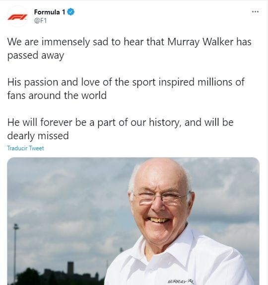 "Estamos inmensamente tristes de saber que Murray Walker ha fallecido. Su pasión y amor por el deporte inspiró a millones de fanáticos en todo el mundo. Siempre será parte de nuestra historia y lo extrañaremos mucho", escribió la cuenta oficial de la categoría al enterarse la triste noticia.