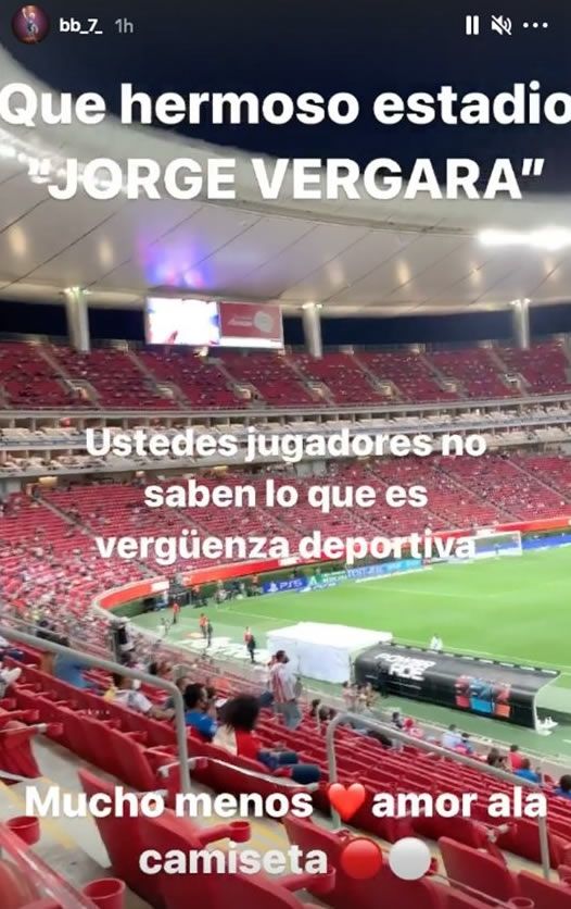 El Bofo subió una historia a su cuenta de Instagram con un breve video en el que se veía el estadio de las Chivas, con un puñado de personas que pudieron asistir al encuentro. "Qué hermoso estadio Jorge Vergara", escribió, y más abajo puso "ustedes jugadores no saben lo que es vergüenza deportiva, mucho menos amor a la camiseta", disparó.