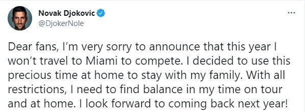 El número uno del mundo, Novak Djokovic, ha renunciado al Masters 1.000 de Miami, primero de la temporada, para "quedarse en casa este tiempo, con su "familia", según ha explicado este viernes en un breve mensaje a través de las redes sociales.