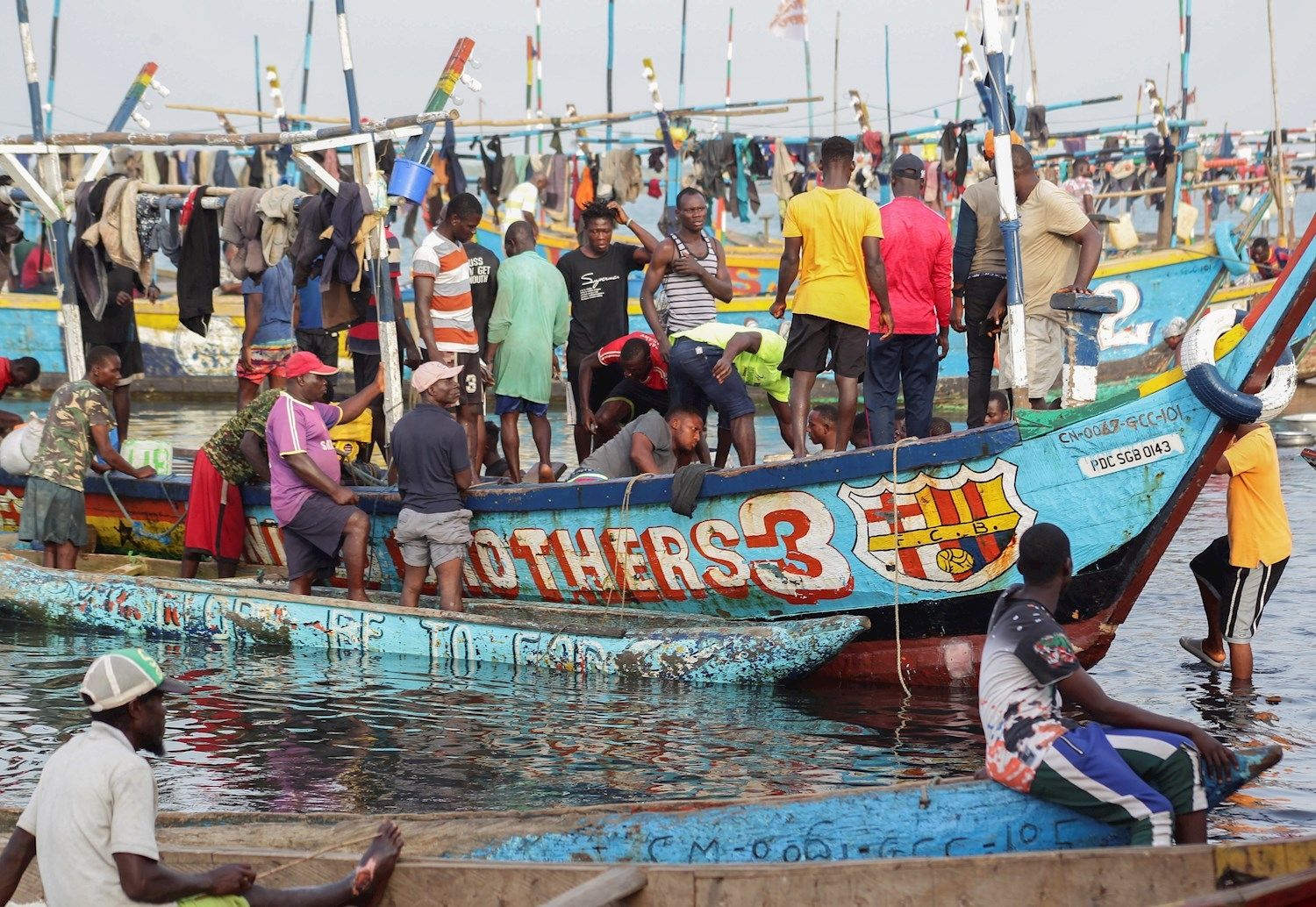 Las actividades económicas del Recinto Barcelona han atraído a pescadores migrantes de Ghana y otros países vecinos creando oportunidades de empleo y comercio para los lugareños que contribuyen al sector pesquero del país, mientras los nenes corren por las calles jugando a la pelota y soñando con ser, algún día, el nuevo Messi.
