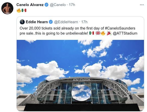 Canelo Álvarez reaccionó en las redes, incrementando la expectativa para su combate ante Saunders. En Twitter, citó el mensaje de Hearn sobre las 20 mil entradas vendidas con el emoji del fuego y de la bandera de México.