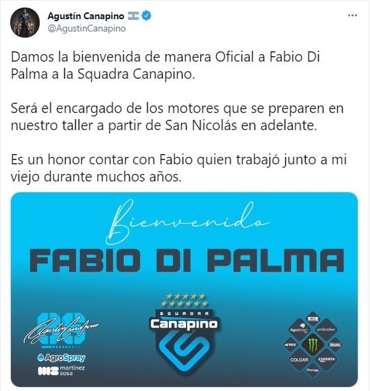 Agustín Canapino anunció que su nuevo preparador de los motores del Chevrolet de Turismo Carretera (TC) será su coterráneo Fabio Di Palma, quien se hará cargo de las plantas impulsores a partir de la semana que viene tras la tercera fecha que disputará la categoría el fin de semana en San Nicolás.