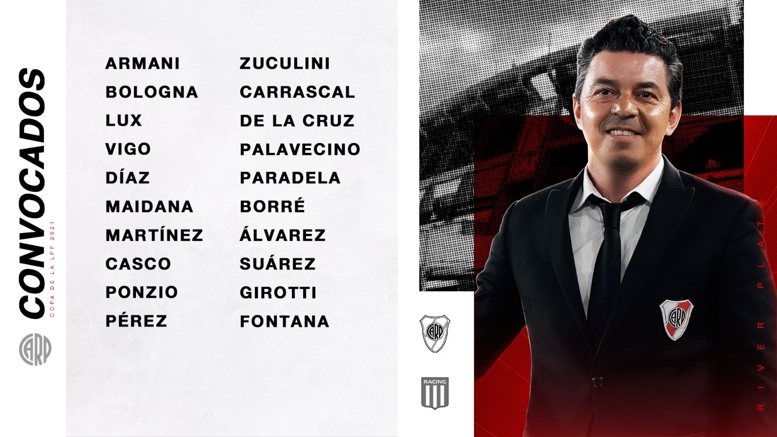 Por la séptima fecha de la Copa Liga Profesional, River recibirá el domingo que viene a Racing en el estadio Monumental. Marcelo Gallardo, entrenador del Millonario, aún no definió al equipo que enfrentará al conjunto de Pizzi pero con la publicación de la lista de concentrados quedó confirmado que tanto Gonzalo Montiel como Fabrizio Angileri se quedan afuera del clásico.