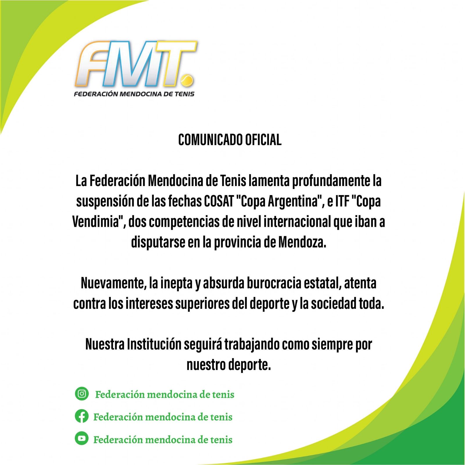 El próximo lunes 8 de marzo iban a comenzar los cuadros principales de la tradicional “Copa Vendimia”, con sede en el Andino Tenis Club y destinados para jugadores sub 18 y la “Copa Argentina”, a disputarse en el Club Mendoza de Regatas, para menores de 14 y 16 años.