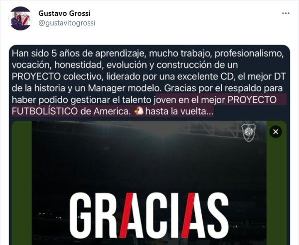 "Han sido 5 años de aprendizaje, mucho trabajo, profesionalismo, vocación, honestidad, evolución y construcción de un proyecto colectivo, liderado por una excelente Comisión Directiva, el mejor DT de la historia y un mánager modelo", escribió Grossi en sus redes sociales.