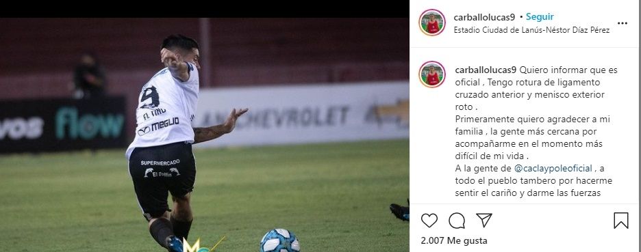 De esta manera, el jugador, que fue golpeado por el mediocampista xeneize, Nicolás Capaldo, pasará alrededor de seis meses fuera de las canchas. "Quiero agradecer a la gente de Claypole, a todo el pueblo ‘tambero’ por hacerme sentir el cariño y darme las fuerzas necesarias para seguir en pie", escribió Carballo, que duró solamente 14 minutos en el encuentro jugado en Lanús.