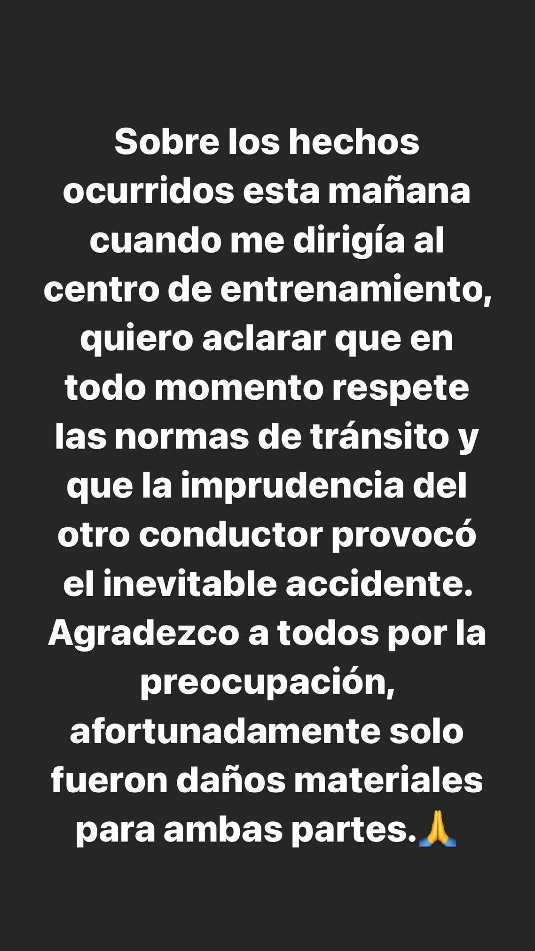 "Sobre los hechos ocurridos esta mañana cuando me dirigía al centro de entrenamiento, quiero aclarar que en todo momento respeté las normas de tránsito y que la imprudencia del otro conductor provocó el inevitable accidente. Agradezco a todos por la preocupación, afortunadamente sólo fueron daños materiales para ambas partes", manifestó el colombiano.