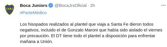 En la previa del partido ante Unión de Santa Fe por la Copa de la Liga Profesional, todos los testeos realizados dieron negativo, incluído el de Gonzalo Maroni, quien había sido aislado ayer. De todas maneras, el futbolista se queda en Buenos Aires por precaución.