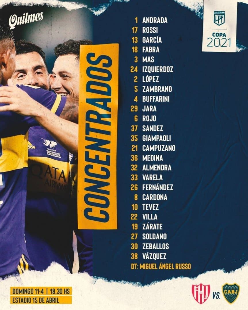 Además, Edwin Cardona (recuperado de una lesión muscular grado dos en el recto anterior izquierdo) y Maurzo Zárate pelean por el lugar de Exequiel Zeballos. De esa manera, y con la línea de tres (o cinco) en el fondo, Boca arrancaría con: Andrada; Zambrano, Izquierdoz, Rojo; Buffarini, Campuzano, Medina o Almendra, Frank Fabra; Cardona o Zárate, Tevez y Villa.