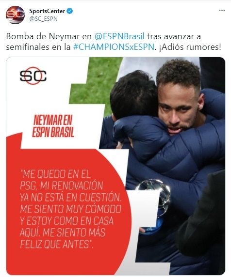 Al terminar el duelo con el Bayern, fue consultado sobre su futuro y expresó: "¿Quedarme en París? El PSG es un gran equipo, ahora estamos en semifinales y soñamos en grande, estoy muy contento.", respondió a los micrófonos de RMC Sport. Sin embargo, minutos después, dialogó con ESPN Brasil y lanzó una verdadera bomba.