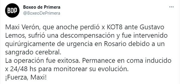 Verón, que permanece en el hospital de Rosario acompañado de su familia, recibió un duro castigo de Lemos, lo que obligó al árbitro Mario González a decretar el nocaut técnico cuando promediaba el octavo de los diez rounds pactados. El bonaerense (12-4-1-1 sd, 4 KOs), no peleaba desde noviembre de 2019 cuando se impuso a Diego Ramírez y obtuvo el título latino welter de la FIB.