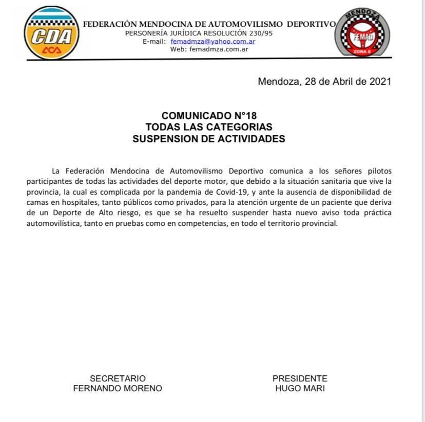 El automovilismo se guarda en boxes hasta nuevo aviso. Luego de disputarse la tercera fecha del Zonal Cuyano en San Juan, y teniendo en cuenta que la siguiente cita sería en nuestra provincia, la Federación Mendocina de Automovilismo Deportivo (FEMAD) emitió un comunicado para informar que suspende todas sus actividades.