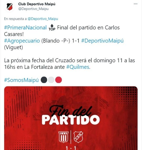 Deportivo Maipú sumó y eso es lo importante. Si bien todavía no pudo ganar, el Cruzado se vuelve a Mendoza con muchas cosas positivas. Empató 1 a 1 ante Agropecuario, uno de los candidatos al ascenso, y por momentos superó a su rival que recién en el complemento pudo poner tablas en el marcador.
