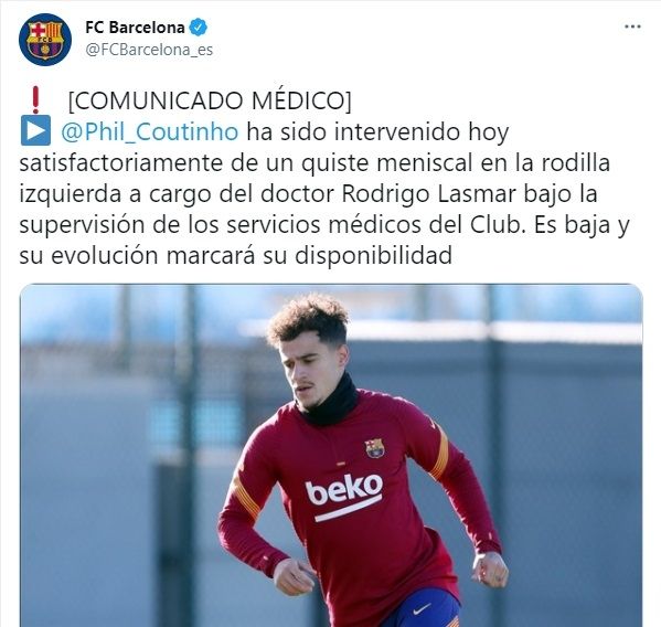 "Coutinho ha sido intervenido hoy satisfactoriamente de un quiste meniscal en la rodilla izquierda a cargo del doctor Rodrigo Lasmar bajo la supervisión de los servicios médicos del Club. Es baja y su evolución marcará su disponibilidad", reza el comunicado compartido por el club en las redes sociales.