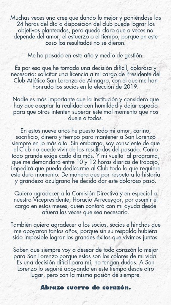 "Es por eso que he tomado una decisión difícil, dolorosa y necesaria: solicitar una licencia a mi cargo de presidente del Club Atlético San Lorenzo de Almagro, con el que me han honrado los socios en la elección del 2019", agregó, anunciando además que será sustituido por el vicepresidente primero, Carlos Horacio Arreceygor.