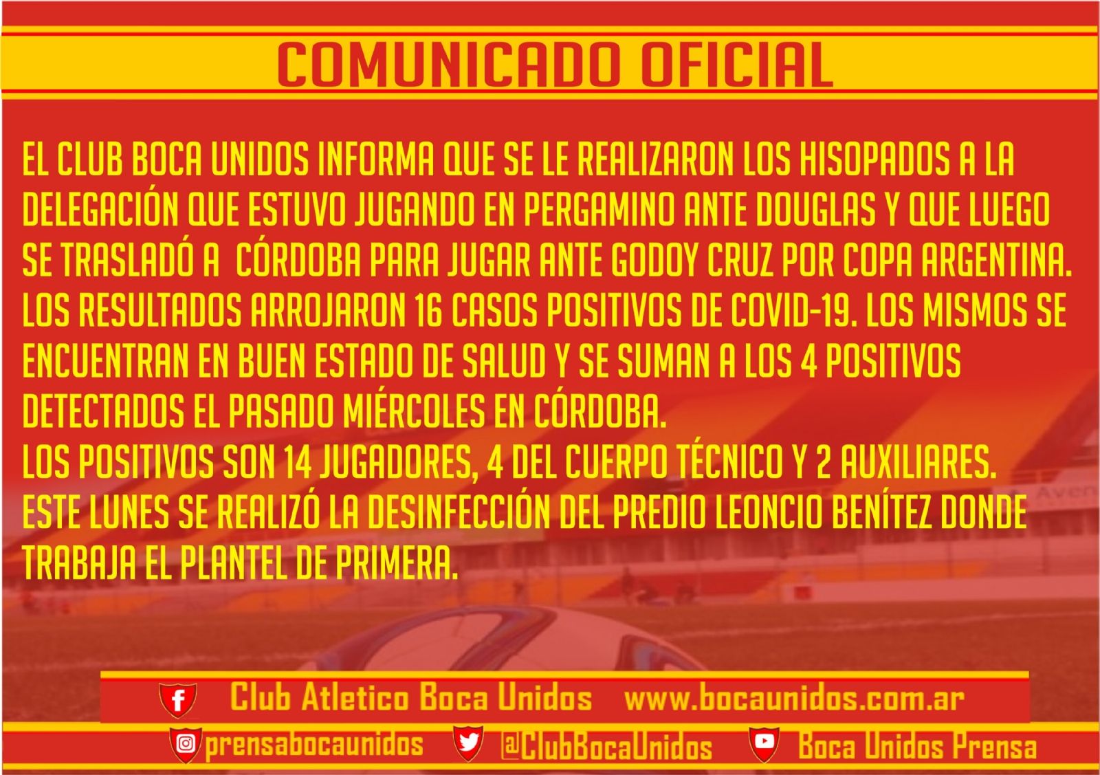 "El Club Boca Unidos informa que se le realizaron los hisopados a la delegación que estuvo jugando en Pergamino ante Douglas y que luego se trasladó a Córdoba para jugar ante Godoy Cruz por Copa Argentina", comenzó diciendo el comunicado oficial.