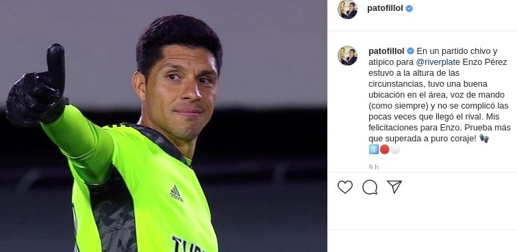 "En un partido chivo y atípico para River, Enzo Pérez estuvo a la altura de las circunstancias, tuvo una buena ubicación en el área, voz de mando (como siempre) y no se complicó las pocas veces que llegó el rival. Mis felicitaciones para Enzo. Prueba más que superada a puro coraje!", escribió el Pato junto a una foto del maipucino en su cuenta de Instagram.