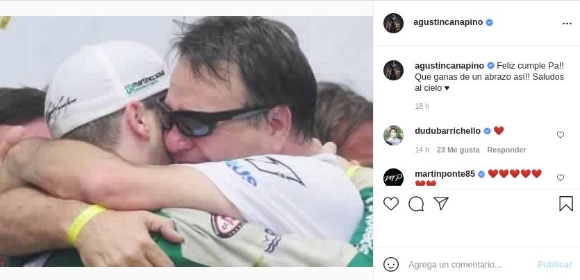 El piloto de Chevrolet Agustín Canapino, líder del campeonato de Turismo Carretera, es uno de los más populares de la categoría y, por ende, uno de los más seguidos en las redes sociales, donde continuamente comparte algunas cosas de su profesión y, cada tanto, de su vida personal.