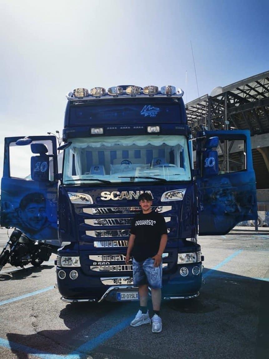 Con "Grande amore" de Il Volo o "La Mano de Dios" de Rodrigo de fondo, el Scania está tremendo. Su dueño se llama Pasquale Rea, un italiano fanático de Napoli y por supuesto de Maradona. El camionero acondicionó su herramienta de trabajo con las imágenes más significativas de la vida del Pelusa: desde un purrete en Argentinos Juniors hasta fotos en Boca y la Selección Argentina, e incluso una en cuero mostrando su tatuaje del Che Guevara. Obvio, con la celeste del Napoli no faltaron.