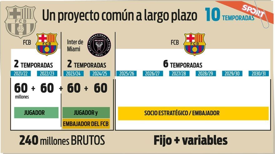 Las cifras del contrato de Leo Messi mientras sea futbolista, a día de hoy, están claras: 240 millones de euros brutos a repartir en cuatro temporadas, las dos que jugaría como blaugrana y las dos en las que ejercería de embajador mientras juega la MLS. Se trata de una rebaja sustancial de lo que percibe a día de hoy cada año, aunque suavizada al mantener la ficha una vez abandone el Camp Nou. De ahí las palabras de Laporta: ”Está valorando mucho el esfuerzo que estamos haciendo”. Y es que el propio presidente también ha explicado que "seguro que Leo merece mucho más y puede conseguir mucho más".